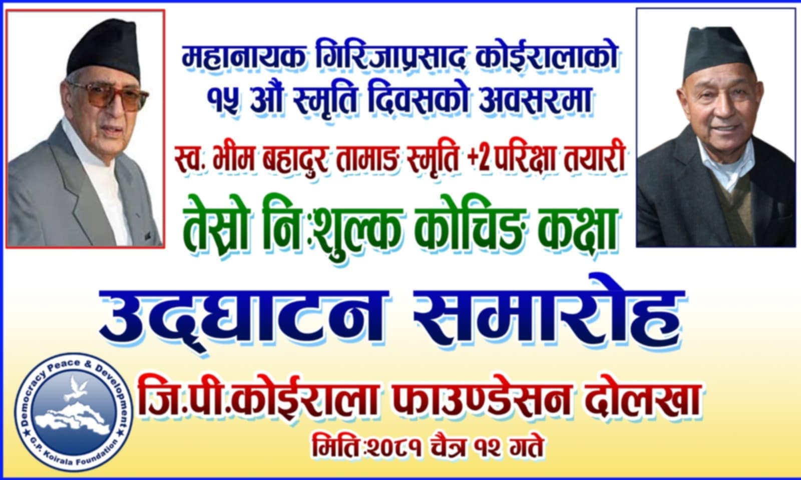 नेपाली कांग्रेसका पूर्व पार्टी सभापति स्व. गिरिजाप्रसाद कोईरालाको १५ औं स्मृति दिवसका अवसरमा जी.पी. कोईराला फाउन्डेसन दोलखाले स्व. भीम बहादुर तामाङ स्मृति +2 परीक्षा तयारी तेस्रो निःशुल्क कोचिङ कक्षाको उद्घाटन समारोह सम्पन्न गरेको छ।
