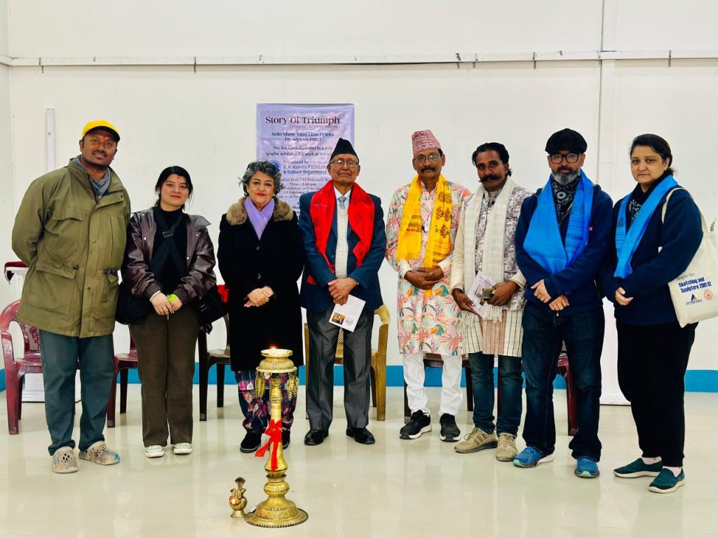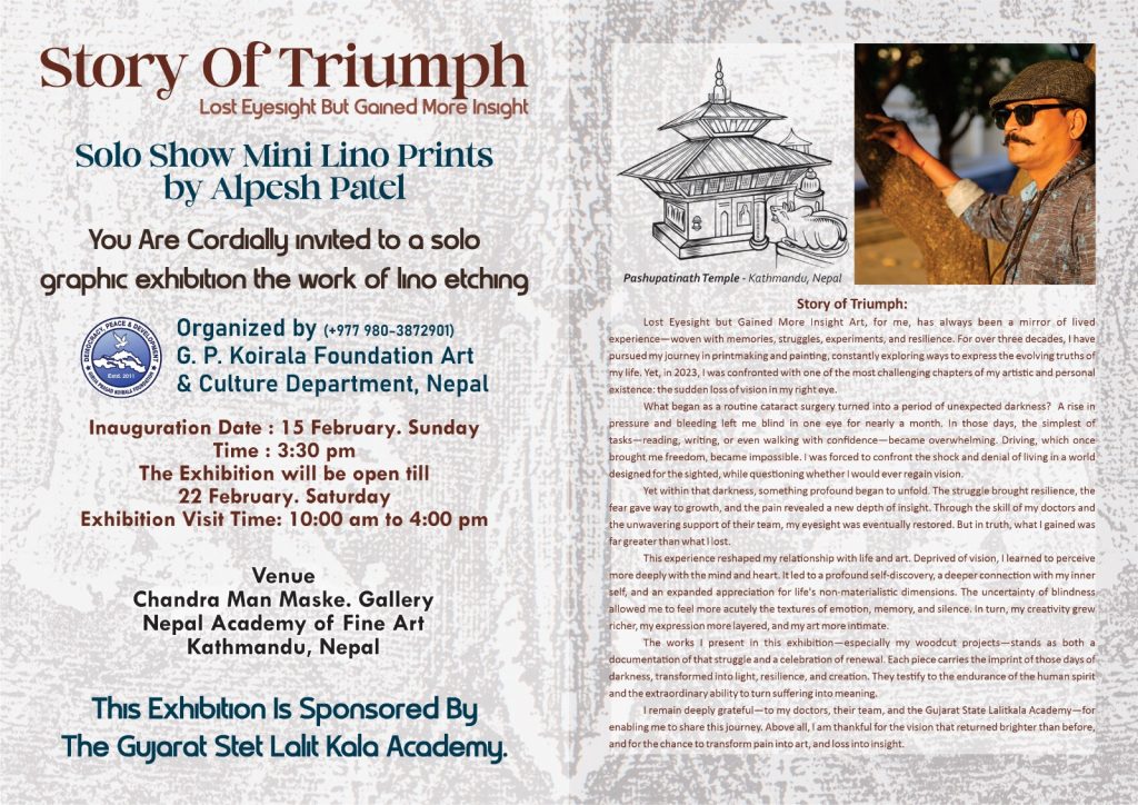 The G. P. Koirala (GPK) Foundation’s Art & Culture Department is honored to announce and host a remarkable solo exhibition, “Story Of Triumph,” featuring the evocative mini lino prints of renowned artist Alpesh Patel. This exhibition serves as a profound testament to the human spirit, subtitled “Lost Eyesight But Gained More Insight.” Through the intricate medium of lino etching and graphic art, Patel invites viewers into a world shaped by unique perception and unwavering creative determination.